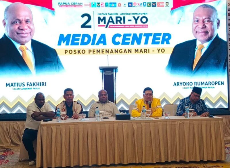 “Jadi, alhamdulillah, dari hasil Exit Poll, pasangan calon gubernur Papua nomor urut 2 Mari-Yo, sekarang sudah unggul 57 persen berbanding 43 persen. Margin of error-nya sebesar 4,5 persen,” ungkap Plt Ketua DPD Partai Golkar Papua Ahmad Doli Kurnia Tandjung didampingi Calon Gubernur Papua Mathius D Fakhiri, Sekretaris Tim Koalisi Papua cerah, Apedius Mote, Ketua Harian partai Gerindra Papua, Geovano Pattipawae dan Juru Bicara Mari-Yo M Rivai Darus dalam pers conference di Media Center Swiss-Belhotel Papua, Rabu, 6 Agustus 2025 pukul 15.00 WIT.