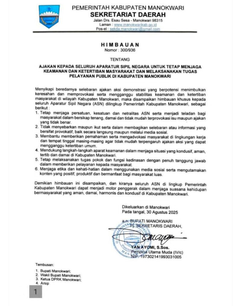 MANOKWARI, Kumparanpapua.com – Pemerintah Kabupaten (Pemkab) Manokwari mengeluarkan imbauan kepada seluruh Aparatur Sipil Negara (ASN) agar tetap menjaga keamanan dan ketertiban masyarakat (kamtibmas) serta menjalankan tugas pelayanan publik dengan baik.