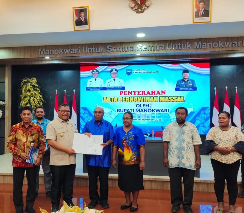 MANOKWARI, Kumparanpapua.com – Bupati Manokwari Serahkan 100 Akta Perkawinan Massal, wujud dukungan pemerintah dalam peningkatan layanan administrasi kependudukan
