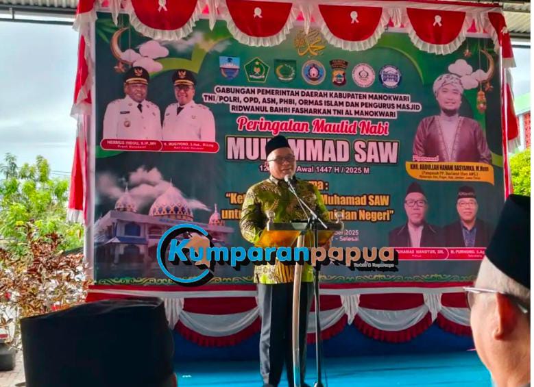 MANOKWARI, Kumparanpapua.com – Wakil Bupati Manokwari, H. Mugiyono, mengajak umat Islam meneladani akhlak Rasulullah dalam kehidupan sehari-hari. Pesan itu ia sampaikan pada peringatan Maulid Nabi Muhammad SAW 1447 H/2025 M di Masjid Ridwanul Bahari Fhasarkan, Sabtu (6/9).